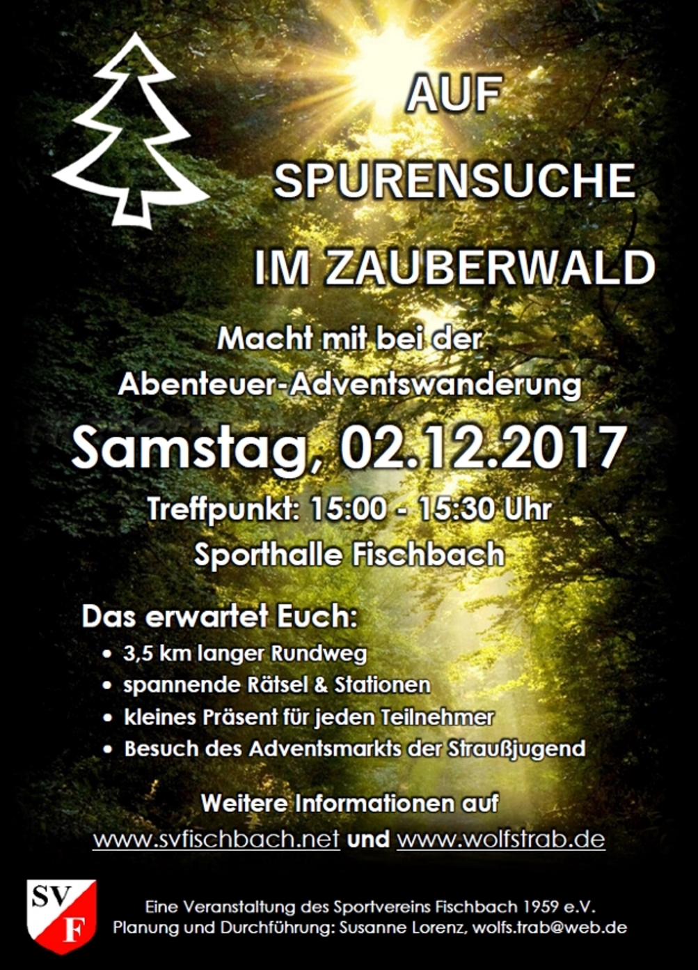 Unter diesem Motto lädt der SV Fischbach 1959 e.V. auch in diesem Jahr am Samstag, den 02.12.2017 zur Abenteuer-Adventswanderung im Zauberwald ein.